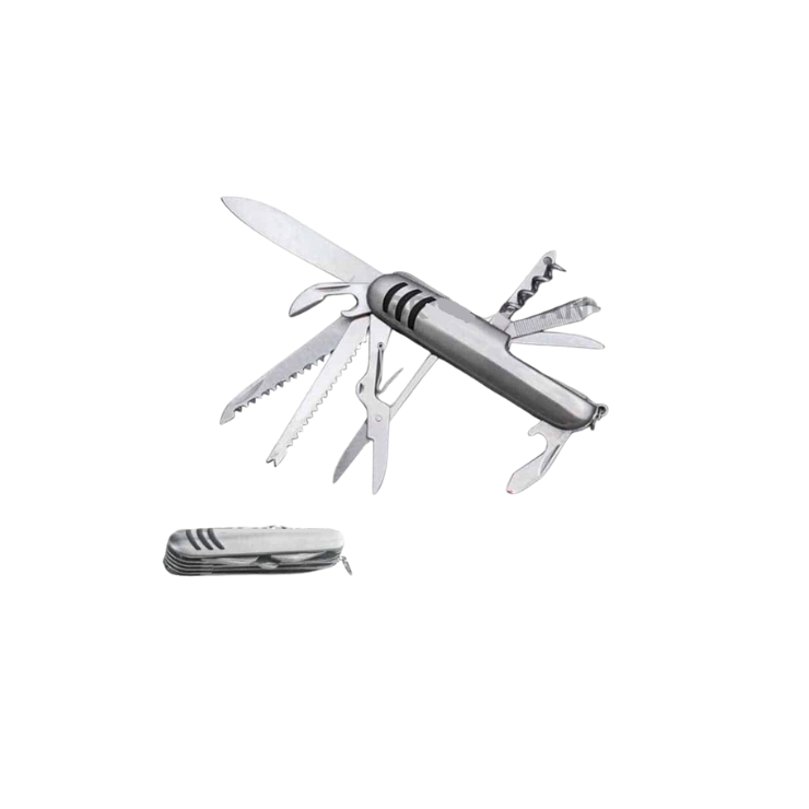 Medidas: 2x 2 x9 cm.Navaja Hoja de 6 cm., limpia uñas, saca corchos, 2 tipos de sierra, tijeras, abrelatas, punzón, abridor de botellas con función de destornillador plano, destonillador estrella, pinza quita astillas.