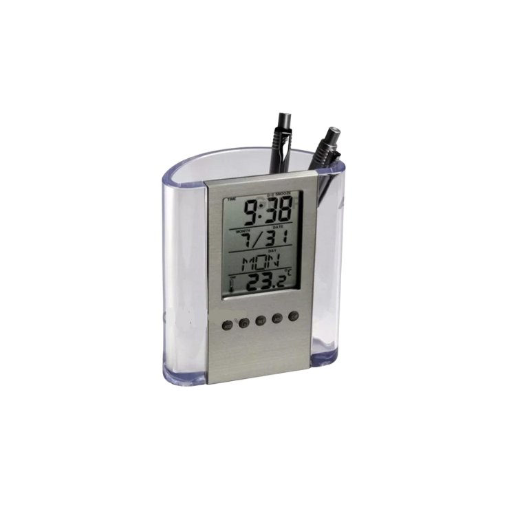 Medidas:  9.5 x 11.5 x 5 cm. Descripción:Portalapicero de plástico transparente con reloj en la parte frontal.