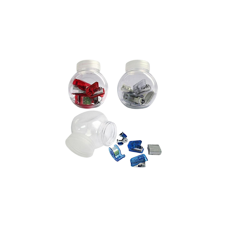 Medidas: : 7,5  x 7 cm.Estuche de plástico traslucido incluye 1 Saca grapas · 1 Engrapadora + repuestos · 1 Cinta Adhesiva · 1 Perforadora de un hueco   Colores: Azul, rojo y blanco.