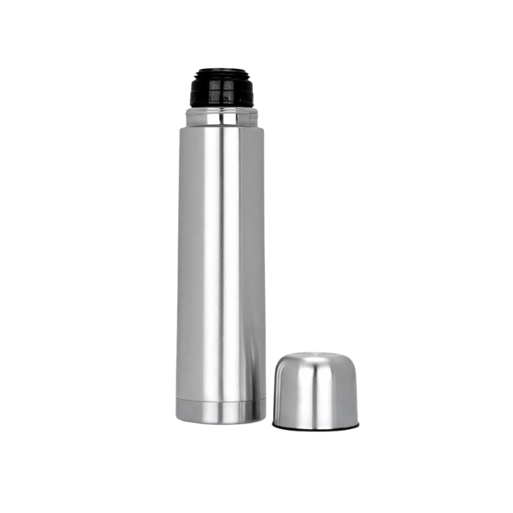 Descripción: Termo metálico de 1 litro Aprox. de capacidad, con funda negra para llevar.